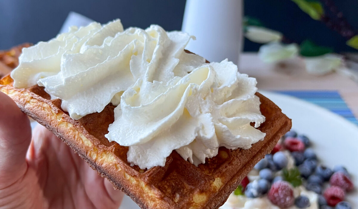 Pyszne gofry w bardzo tradycyjnej wersji: z bitą śmietaną i owocami.